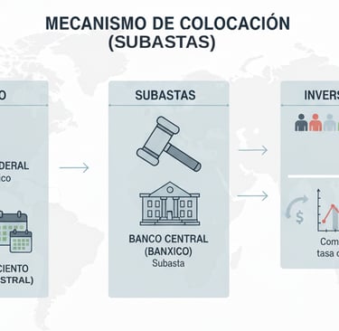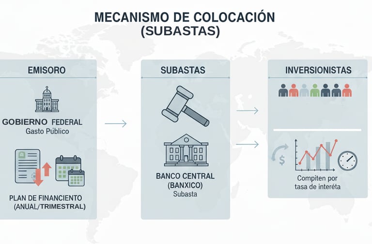 Mecanismo de Colocación (Subastas): En el caso de la deuda gubernamental (ej. Cetes, Bonos M), la colocación se realiza a través de subastas públicas gestionadas por el Banco Central (Banxico en México). El gobierno publica un plan de financiamiento anual y trimestral para garantizar la transparencia y predictibilidad. Los inversionistas compiten por la tasa de interés más conveniente.