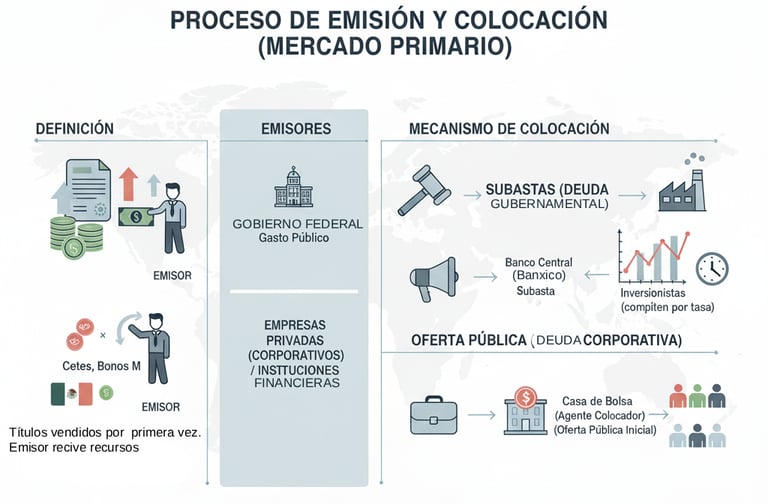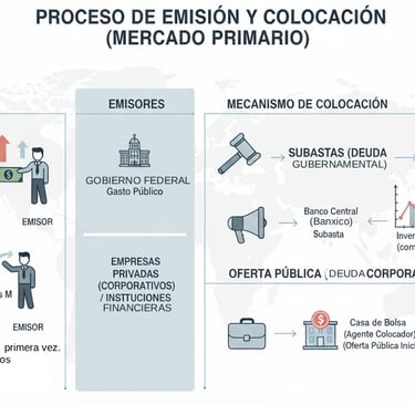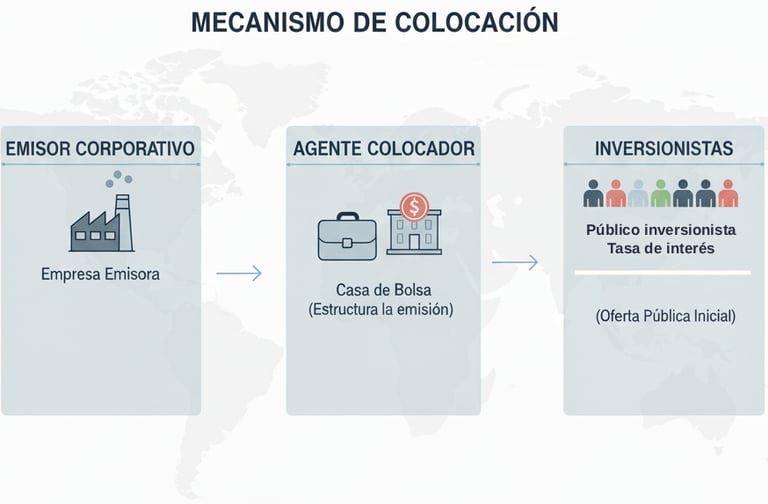 Mecanismo de Colocación (Oferta Pública): Para la deuda corporativa, la empresa emisora trabaja con una Casa de Bolsa (agente colocador) que estructura la emisión y la ofrece al público inversionista (Oferta Pública Inicial de Deuda).
