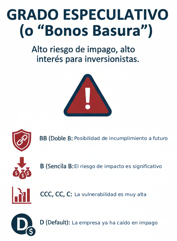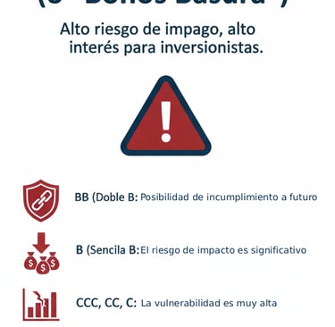 Estas calificaciones indican que existe una incertidumbre considerable sobre la capacidad de pago del emisor. A mayor riesgo, el emisor debe pagar un interés (rendimiento) mucho más alto para atraer inversionistas.