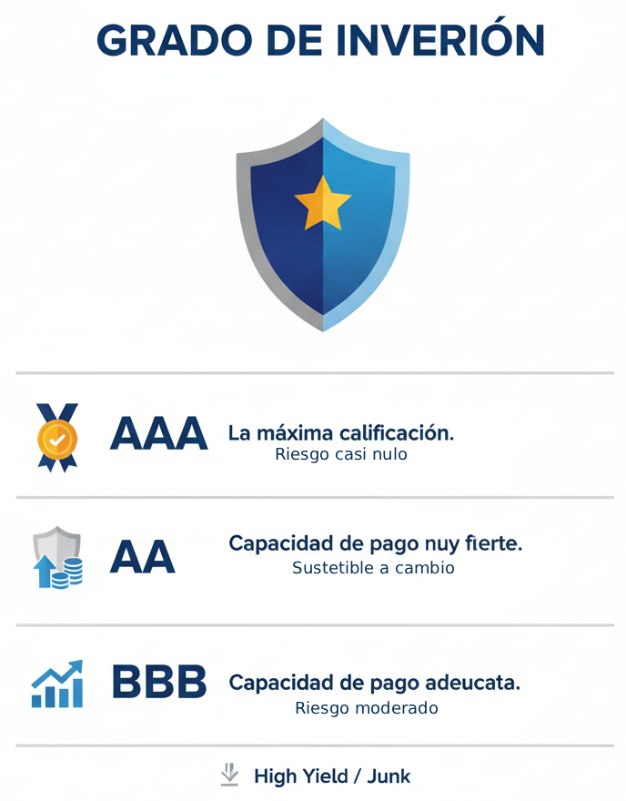AAA (Triple A): La máxima calificación. Capacidad de pago extremadamente fuerte. El riesgo es casi nulo.